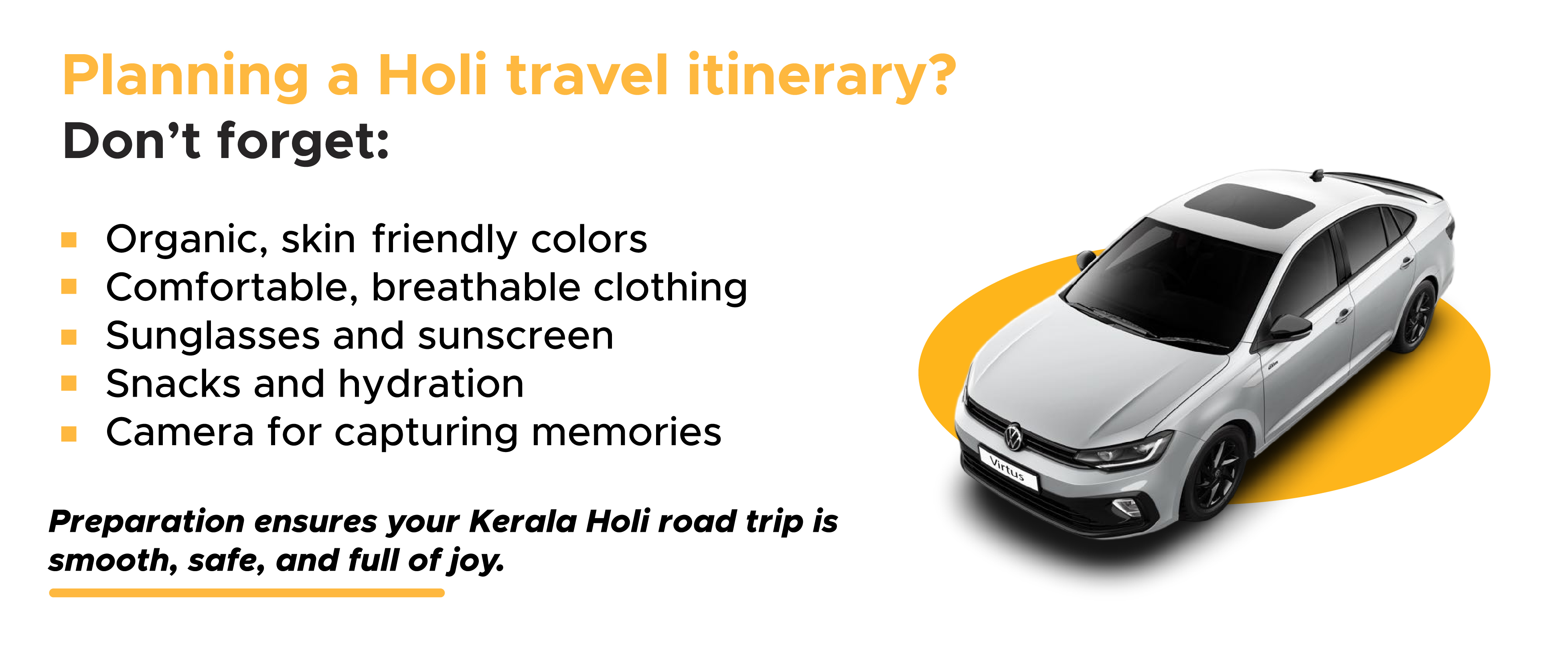 Yellow feels like warmth — like sunlight touching your face. Known as Kerala’s cultural capital, Thrissur welcomes Holi with tradition woven into every celebration. Temple grounds echo with chants and music, community gatherings glow with joy, and every smile feels timeless. A family road trip in a comfortable sedan makes the journey even sweeter. The roads here don’t just lead you forward — they lead you deeper into heritage. In Thrissur, Holi becomes a golden embrace.